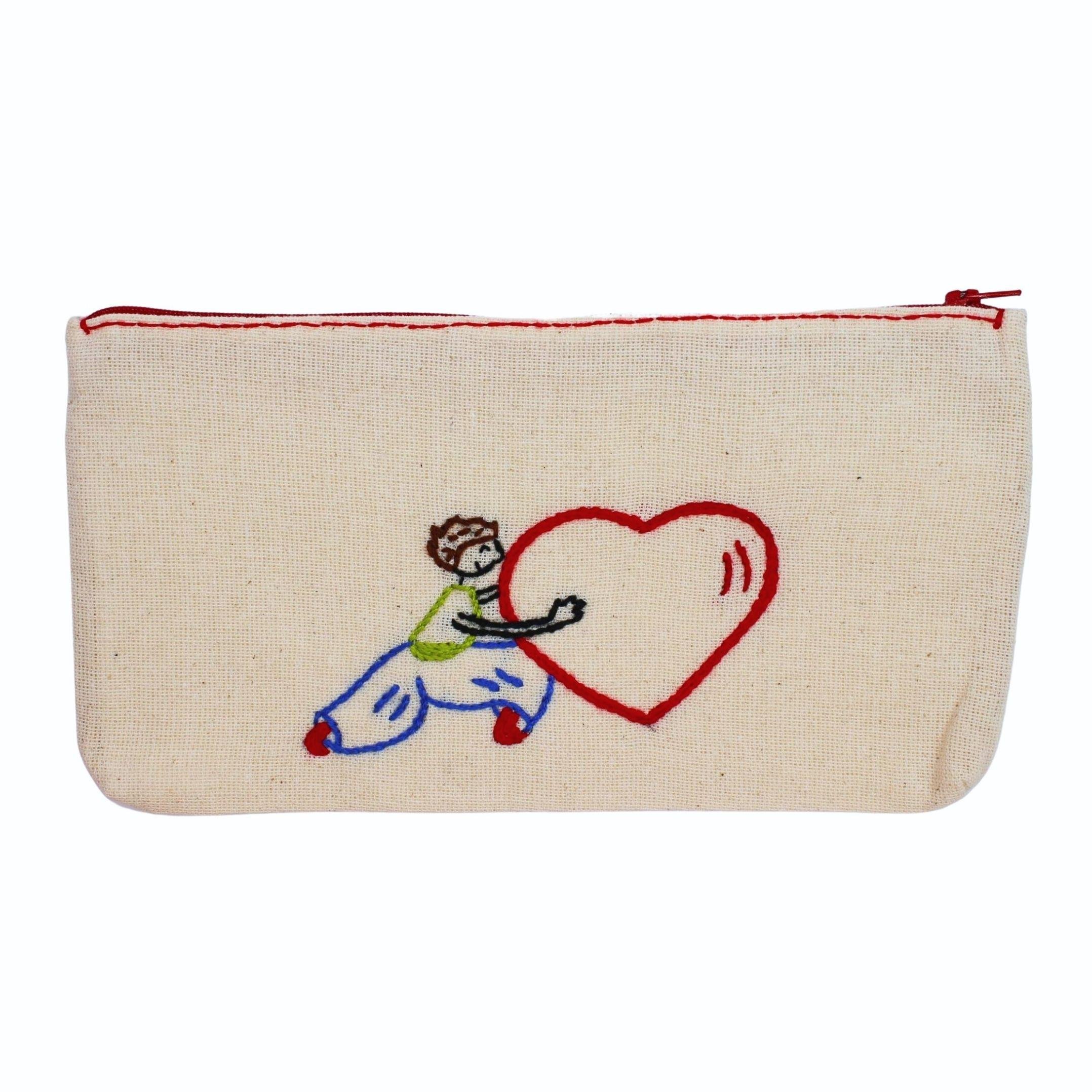 Doğal keten kumaş üzerine el işlemeli, erkek ve kalp nakışlı makyaj çantası.
