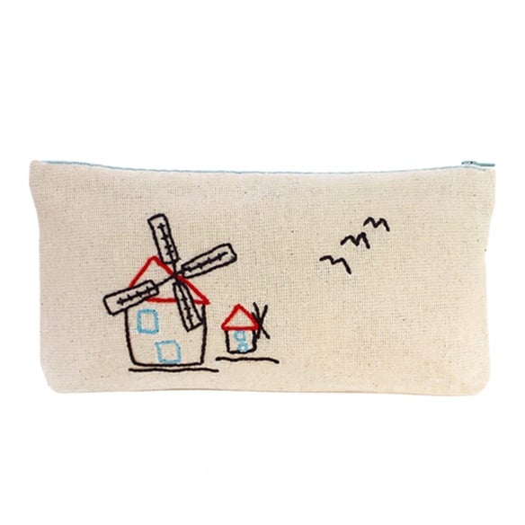 Doğal keten kumaş üzerine el işlemeli, değirmen nakışlı makyaj çantası.