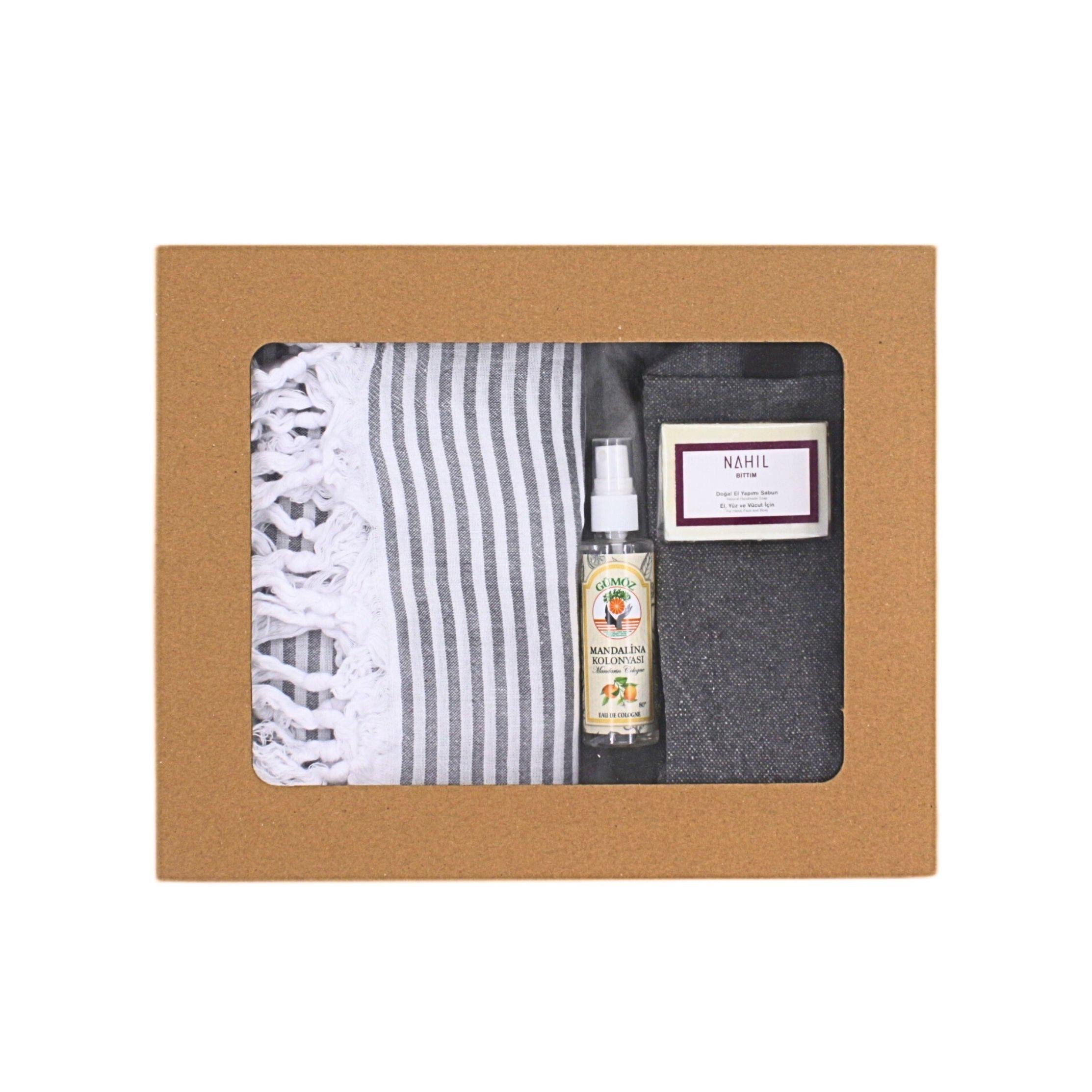 Set; bir adet peştemal, bakım çantası, kolanya ve sabundan oluşmaktadır.