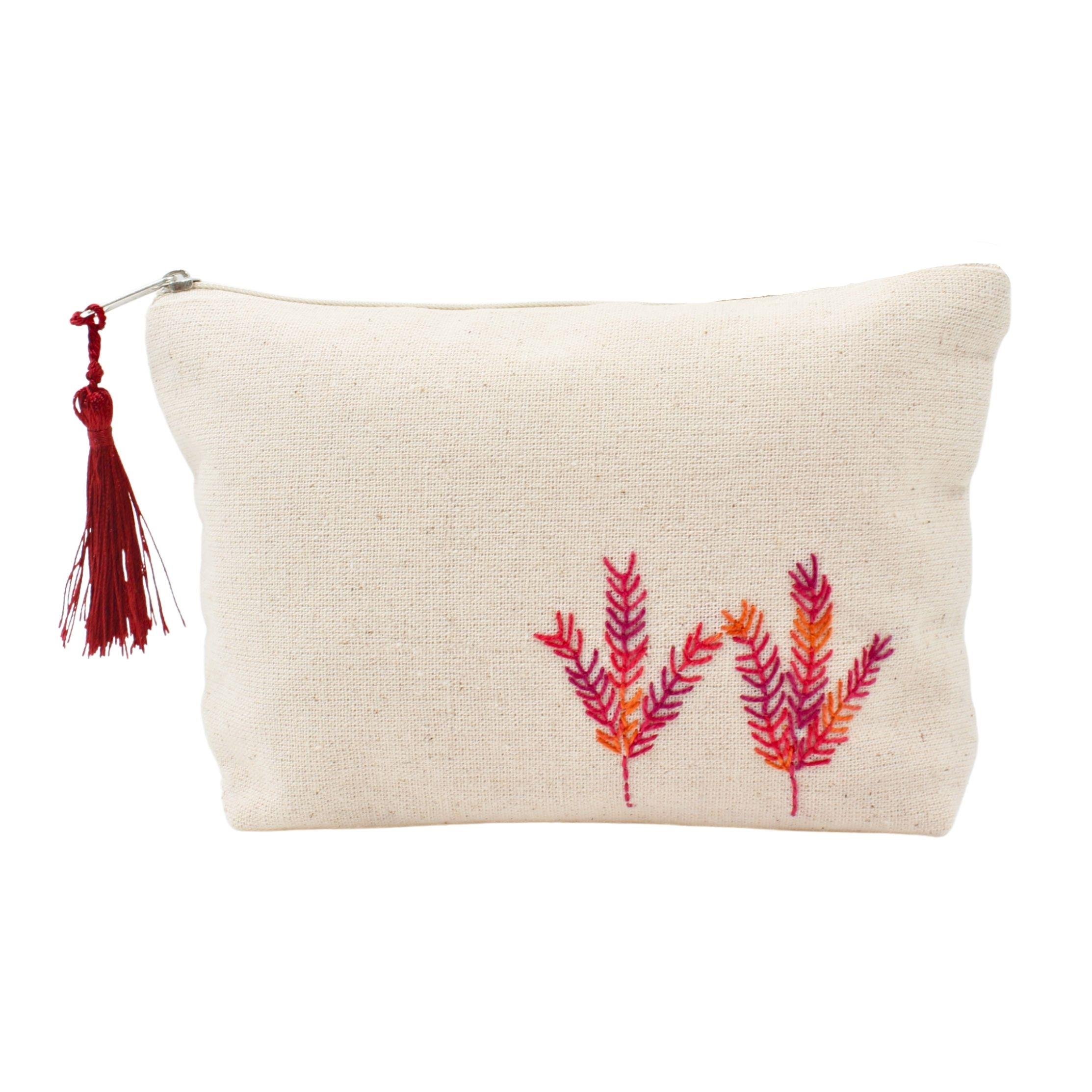 Pamuklu kumaş üzerine işlemeli makyaj çantası.
