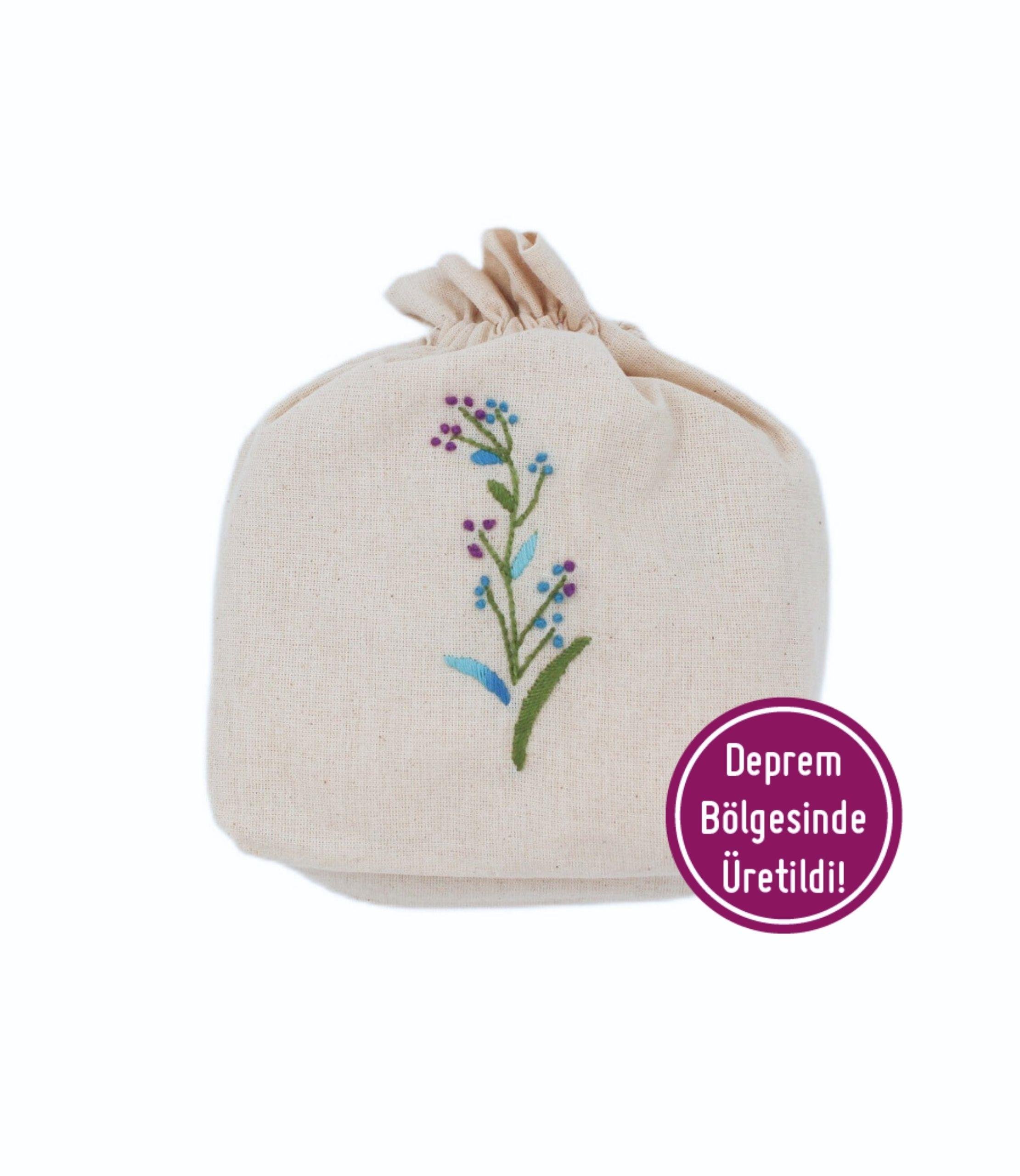 Çiçek nakışlı, pamuklu kese, tekli el havlusu ile birlikte.