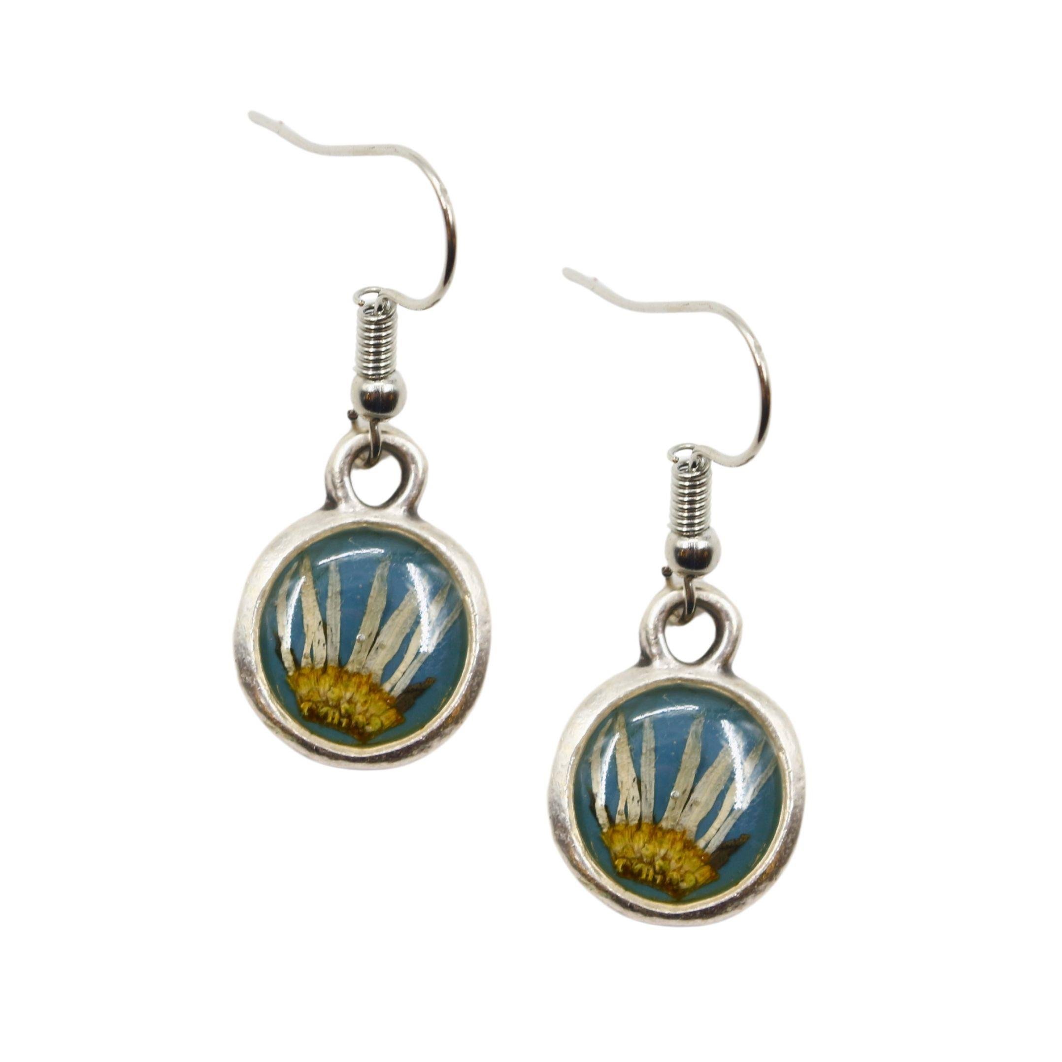 Kuru papatyalı, lacivert renkli, nikel kaplama küpe el emeği ile üretilmiştir.