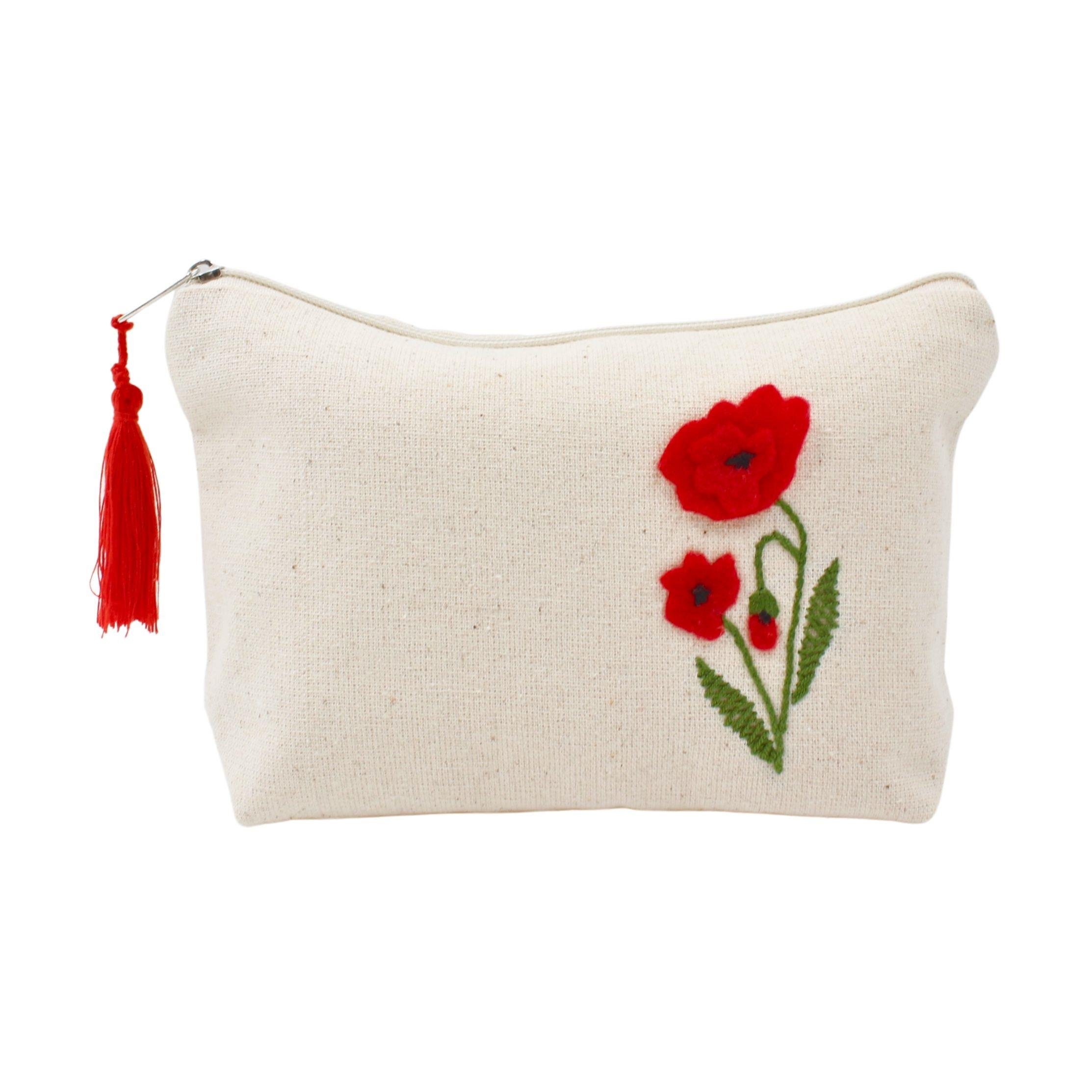 Pamuklu kumaş üzerine gelincik işlemeli makyaj çantası.