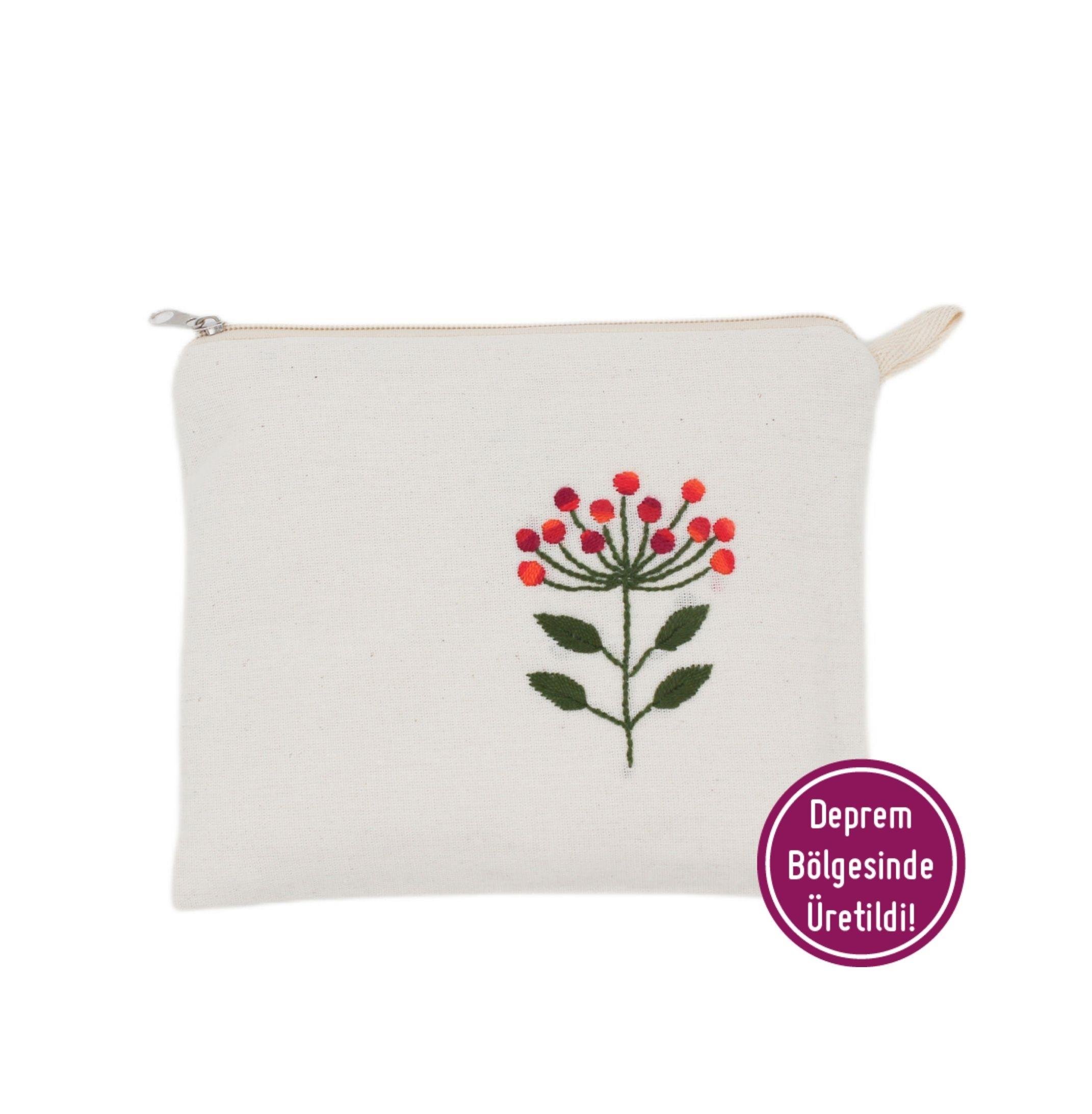 Çiçek nakışlı, pamuklu çanta, tekli el havlusu ve el sabunu ile birlikte.