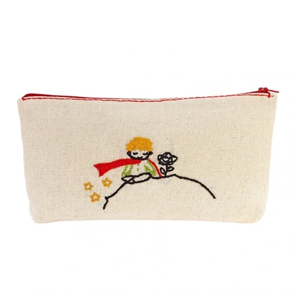 Doğal keten kumaş üzerine el işlemeli, küçük prens nakışlı makyaj çantası.