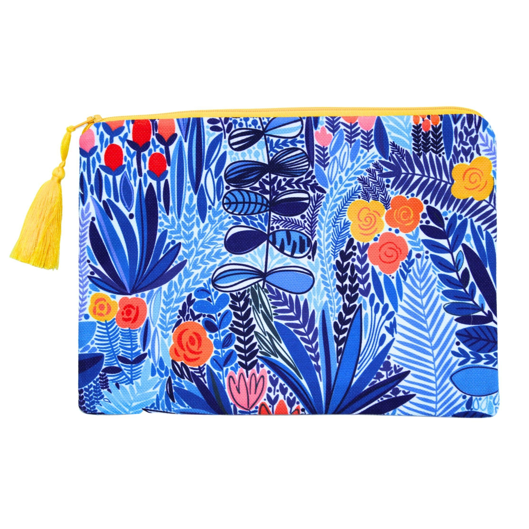 Mavi yapraklı, fermuarlı clutch el çantası.