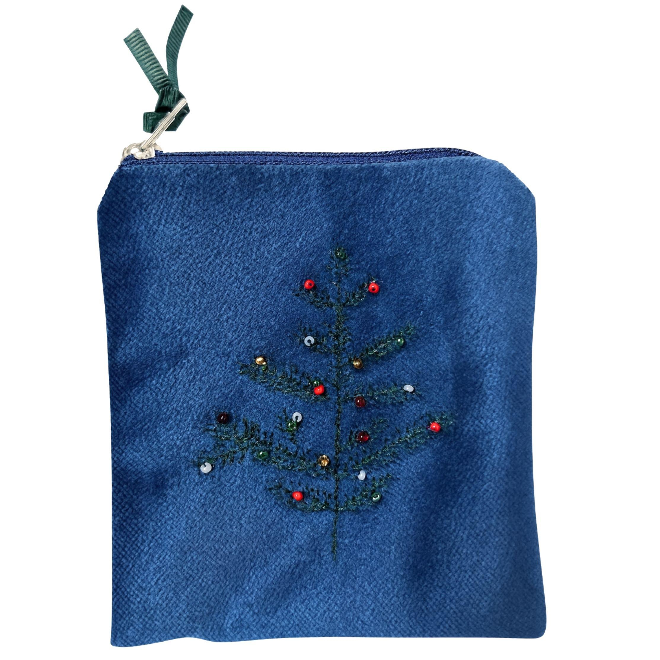 Mavi kumaş üzerine özenle işlenmiş çam ağacı motifi, rengarenk boncuklarla süslenerek özgün bir tasarıma dönüştürüldü.